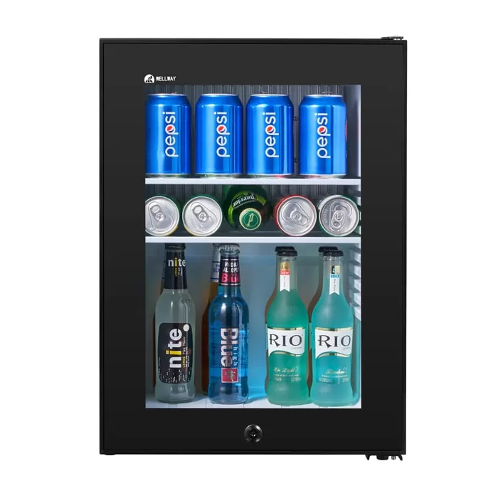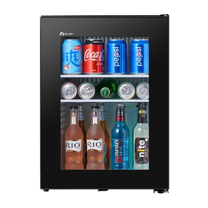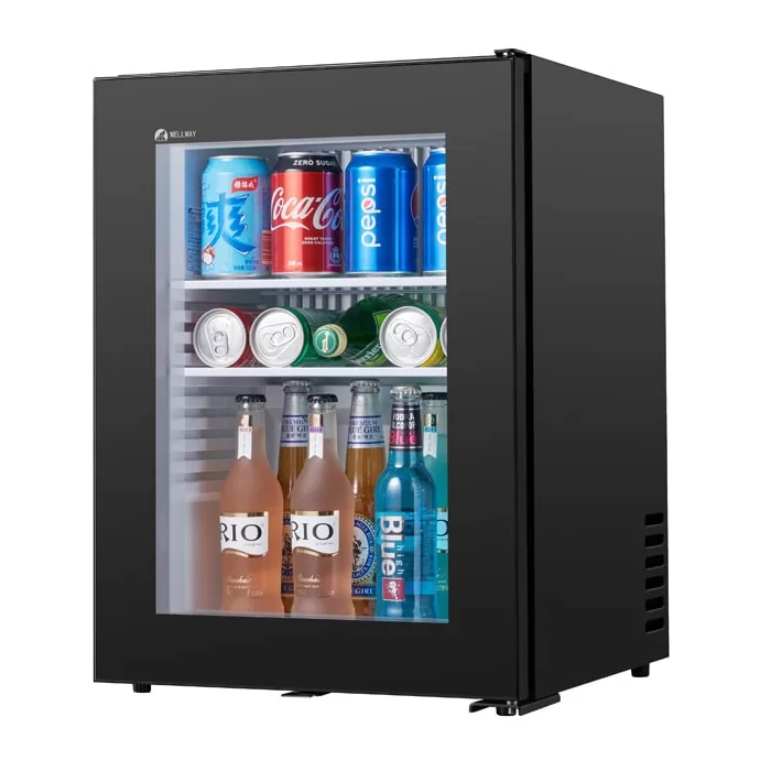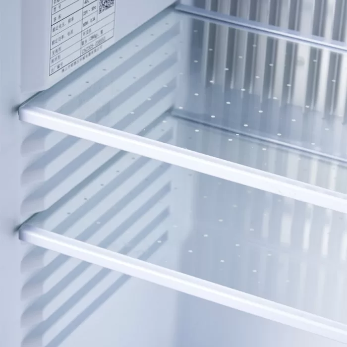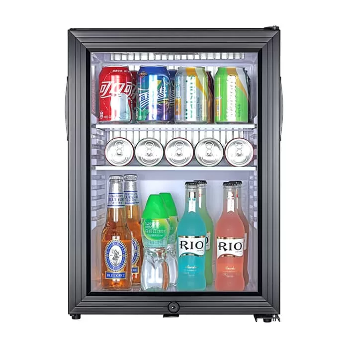This 40L glass door bar refrigerator uses efficient refrigeration technology and is designed for hotel rooms to provide guests with a convenient mini bar experience. Its transparent glass door design can clearly display the drinks inside. It does not need to be opened and closed frequently, effectively reducing the loss of cold air, saving energy, and protecting the environment. At the same time, the capacity of 40L is matched with adjustable shelves, which can flexibly store various drinks.